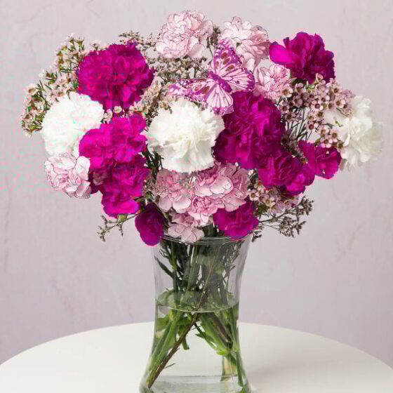 A delightful selection of long-lasting Carnations in shades of pink, purple and white complemented with pink Limonium and delicate Waxflower blooms. Paired with a keepsake butterfly pick for an extra special touch. We send our Carnations in bud to ensure maximum vase life and guarantee our Carnations will last for at least two weeks.