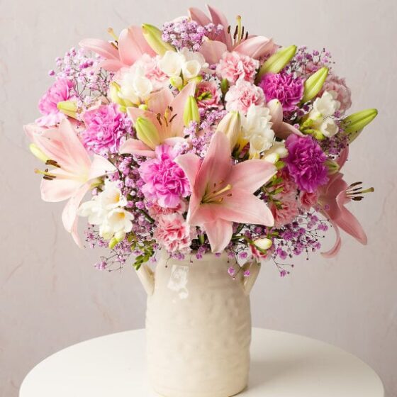 A delicate mix of pale pink Asiatic Lilies alongside Carnations and pure white Freesias. Finished with sweet pink Gypsophila, it will make a gorgeous gift to send for a special occasion, or even just because!