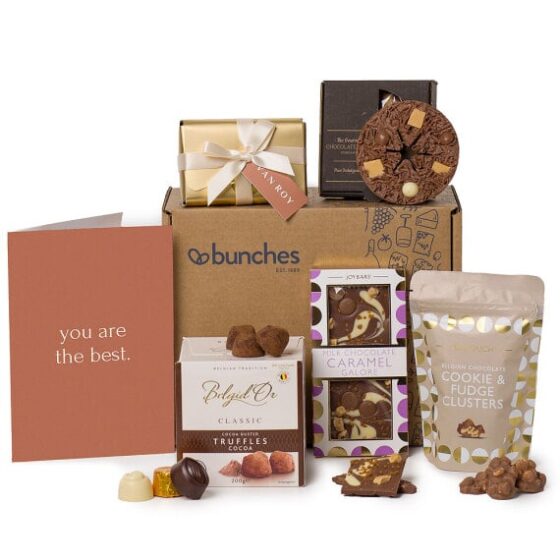 This gourmet hamper features a selection of chocolate treats, including rich chocolate truffles and a milk chocolate caramel slab. Delivered with a premium A5 ‘Happy Birthday To You’ greetings card with your personal message printed inside. This hamper contains 5 items: Joypouch Milk Chocolate Cookie & Fudge Clusters 100g Belgid’Or Belgian Cocoa Dusted Truffles 200g Van Roy Belgian Assortment in Gold Ballotin With Ribbon 195g Joybars Milk Chocolate Caramel Galore Bar 80g Gourmet Chocolate Pizza Co. Heavenly Honeycomb 73g Delivered in a postal gift box.